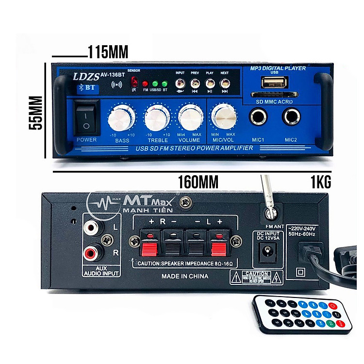 | Phụ kiện đi kèm | Ampli miniAV-136BTbluetooth hát karaoke công suất200wcó thể sử dụng nguồn 220v hoặc 12v khi mất điện hoặc khi di chuyển tới nơi không có điện.Đánh giá Ampli mini bluetooth AV-136BT:- Amply mini AV-136BT có thiết kế đơn giản, nhỏ nhắn, với chức năng khuếch đại tín hiệu rồi truyền đến thiết bị âm thanh, nhờ đó người sử dụng có thể thưởng thức âm nhạc với chất lượng âm thanh sống động. - Bộ khuếch đại âm thanh AV-136BT có thêm chức năng bắt sóng radio, đài fm. Với kích thước nhỏ và sử dụng điện 12V, amply bluetooth còn có thể dùng trên oto, gắn thêm anten sẽ có thể dùng như đài radio, nghe fm. - Công suất tối đa của amply nghe nhạc là 200w.người sử dụng có thể ghép máy với loa có micro để hát karaoke có sẵn echo tích hợp khá tiện dụng, vô cùng tiện lại, như mang đi picnic giải trí để có những giây phút giải trí bên người thân. Bên cạnh đó, amply karaoke AV-136BT còn có khả năng lọc tạp âm, điều chỉnh âm thanh sao cho đầu âm thanh ra được chất lượng nhất, tuỳ vào mong muốn của người sử dụng. - Amply mini AV-136BT tích hợp bluetooth, dễ dàng kết nối, sử dụng an toàn.Công suất tối đa: 2 x 100W- Dòng điện: AC 220V/50Hz, DC 12V/5A- Điện trở: 4 – 16ohm- Trọng lượng: 1kg- Kích thước: 55x160 (mm)#amply_mini#amply_karaoke#amply_bluetooth#amply_giá_rẻ#amply_nghe_nhạc#amply_karaoke_giá_rẻ#amply_loa#amply_karaoke_mini #ampy #136BT #236bt#136BT #136BT#amplyminihay#amply_mini_hay#amplyclassD#amply_classD#amplyclassd#amply_classd |