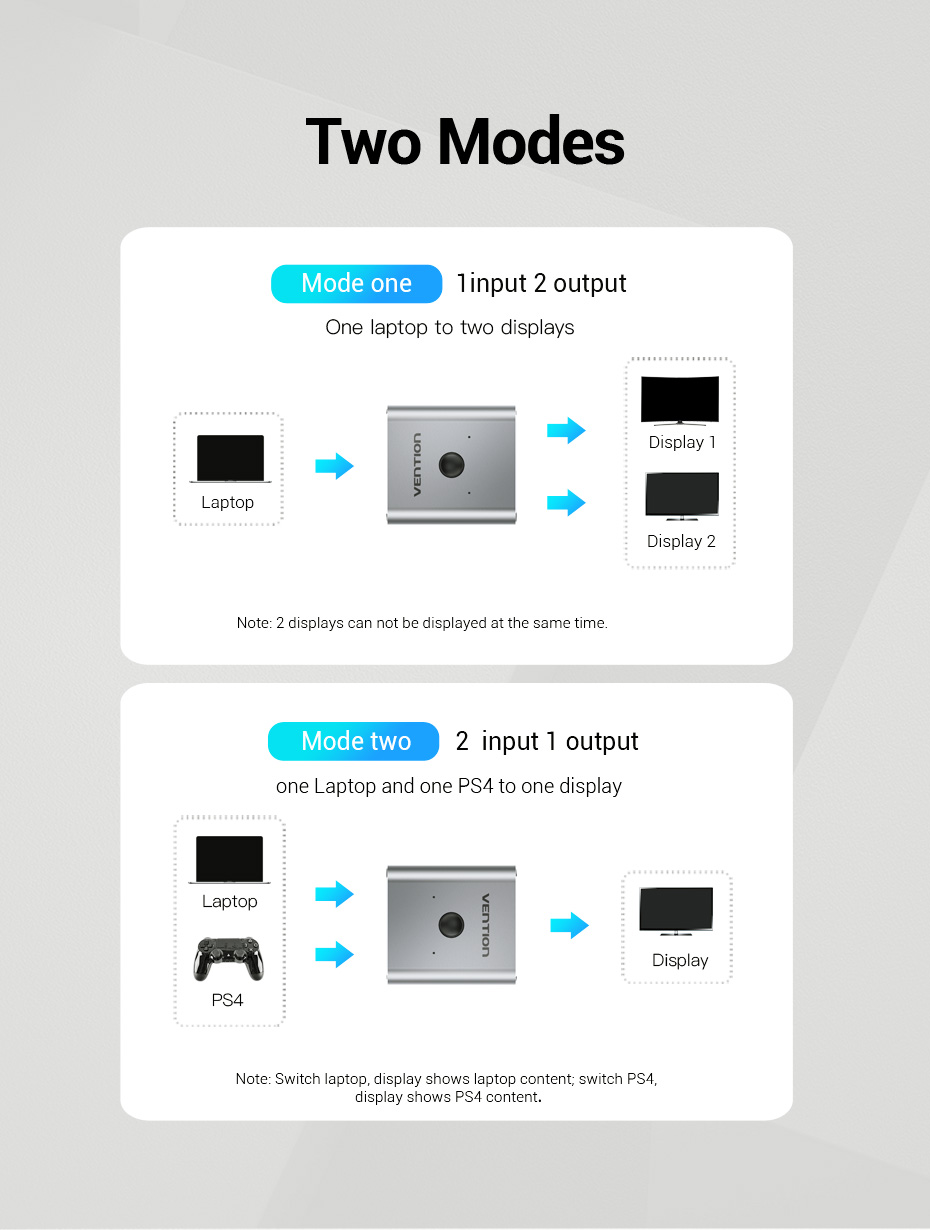- Chia tín hiệu từ 1 ( laptop, máy tính...) ra 2 màn hình, máy chiếu. Không hỗ trợ hoạt động 2 cổng out trong cùng 1 thời điểm.