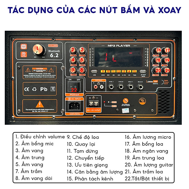 Loa BK47 cung cấp nhiều tính năng điều chỉnh âm thanh và hiệu ứng đa dạng. Các nút nhấn và vặn cho phép bạn tùy chỉnh âm lượng, hiệu ứng âm thanh và cả guitar. Ngoài ra, loa còn hỗ trợ nhiều chế độ khác nhau để bạn có thể thay đổi cách trình bày âm nhạc theo ý muốn. Màn hình LED LCD thông báo trên thẻ hiển thị thông tin liên quan đến loa, giúp bạn dễ dàng kiểm soát và điều chỉnh các thiết lập.